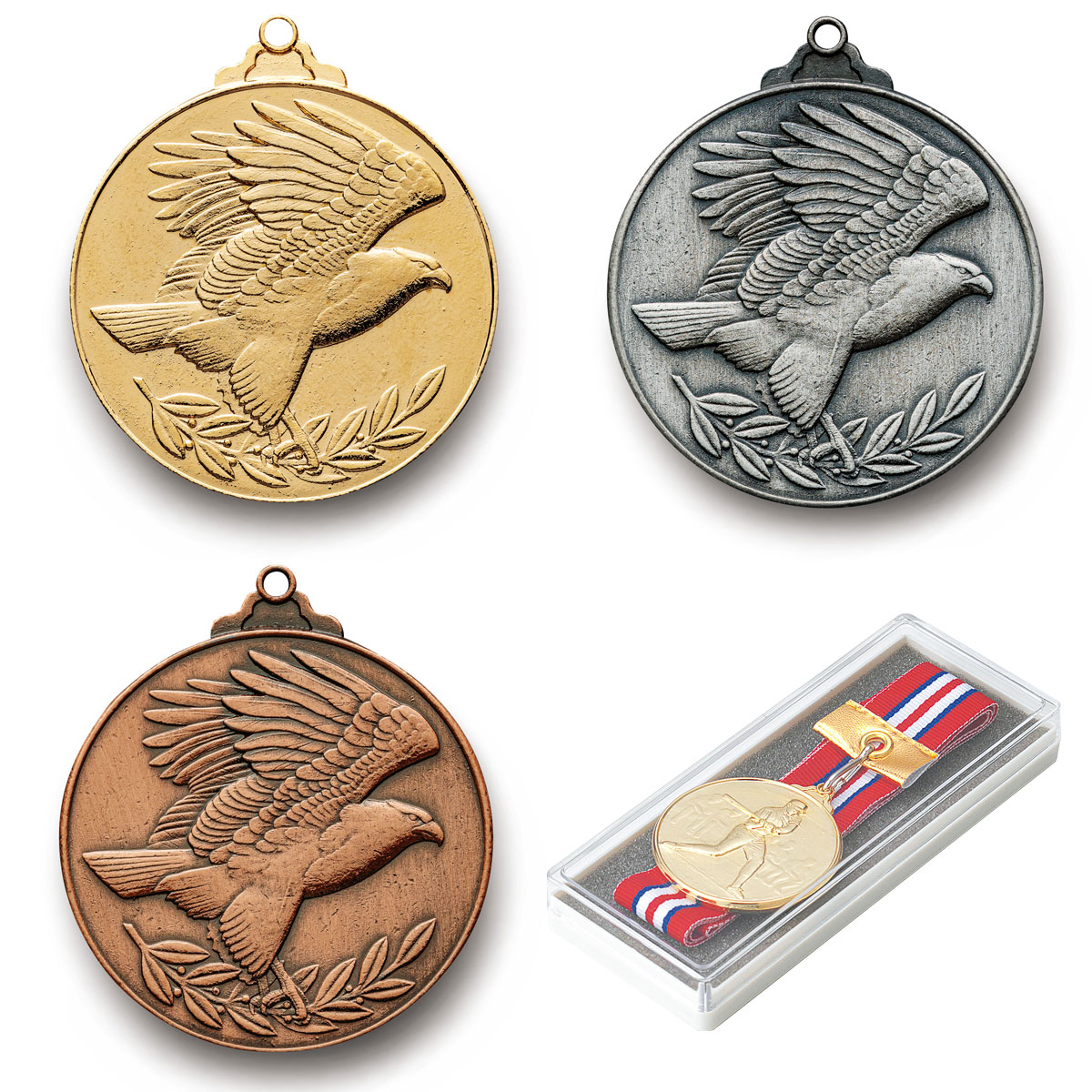 低価格に抑えつつ、しっかりした作りのメダルです。金・銀・銅の色違いに、7つのデザインからお選びいただけます。